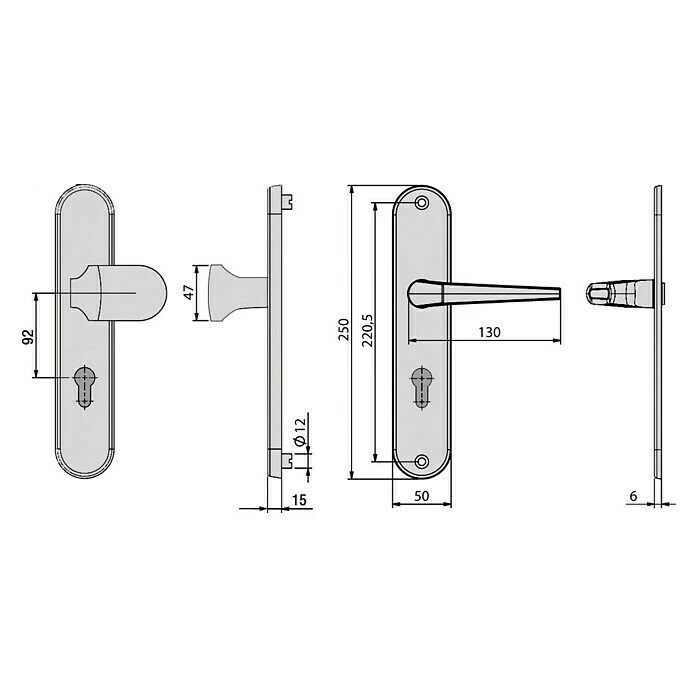 Der hochwertige Vollmaterial-Schutzbeschlag der Marke BASI besteht aus robusten und modernen Aluminium IROX (edelstahlfarben). Der Beschlag besitzt einen abgerundeten, gekröpften Knauf außen und einem Drücker in Standard innen. Das runde Langschild besitzt eine Schildstärke von 15 mm. Die Wechselgarnitur ist mit einem Abstand von 92 mm gefertigt. Der Beschlag kann bei allen Außentüren, Zwischentüren oder Nebeneingangstüren, die nur von einer Seite aus geöffnet sein sollen eingesetzt werden. Zudem kann der Türbeschlag auch bei Wohneingangs- oder Haustüren verwendet werden. Durch die vorgefertigte Profilzylinderlochung für einen Türzylinder, kann die Tür von beiden Seiten mit dem Schlüssel geöffnet werden. Der Schutzbeschlag aus Vollmaterial kann bei Türen mit einer Türblattstärke von 38-42 mm, sowohl DIN LINKS / DIN RECHTS eingesetzt werden. Innen Vierkant mit 10 mm – innen sichtbare Verschraubung.