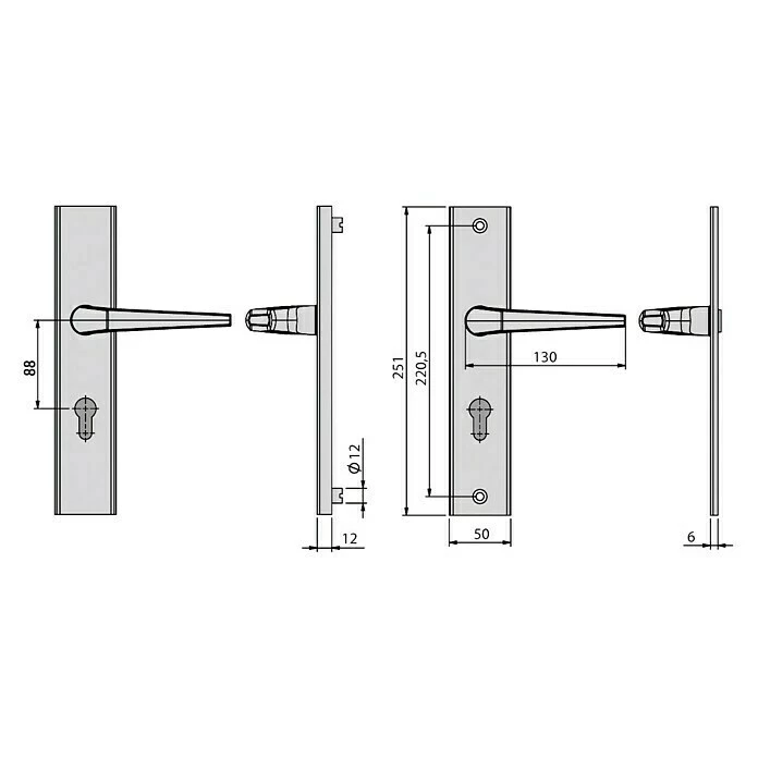 Der massive Vollmaterial-Schutzbeschlag der Marke BASI besteht aus hochwertigem Aluminium F2. Bei dem Beschlag handelt es sich um eine klassische Drücker-Drücker Garnitur mit Standard Griffen. Das eckige Langschild mit einer Schildstärke von 12 mm, sorgt für eine robuste Optik. Der Türbeschlag ist gemäß ÖNORM (österreichischer Norm) mit einem Abstand von 88 mm gefertigt. Der Beschlag besitzt eine vorgefertigte Lochung für einen Türzylinder – wo ohne Probleme ein Profilzylinder eingesetzt werden kann und die Türe somit abschließbar ist. Sie kann bei allen gängigen Wohneingangs- oder Haustüren mit einer Türblattstärke von 38-42 mm, sowohl DIN LINKS / DIN RECHTS eingesetzt werden. Innen Vierkantstift mit 8,5 mm – innen sichtbare Verschraubung.