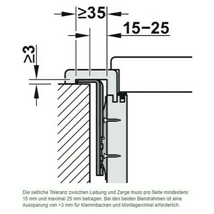 Der Häfele Zargenbefestiger Startec Frame Fix dient zur einfachen mechanischen Befestigung von Innentürzargen aus Holz. Bereits unmittelbar nach der Montage ist die Tür belastbar. Weitere Vorteile des Startec Frame Fix sind eine geringere Umwelt- und Gesundheitsbelastung sowie eine von Temperatur und Luftfeuchtigkeit unabhängige Montage. Der Häfele Zargenbefestiger ist nachträglich justierbar, ein einfacher Rückbau ist möglich. Bei einer späteren Entsorgung fallen keine problematischen Schadstoffe wie Montagschaum, verunreinigte Holzteile usw. an, welche aufwendig beseitigt werden müssten. Hinweis: Pro Zarge sind im Normalfall sechs Befestigungspunkte (Zargenbefestiger) erforderlich. Bei der Kombination von Innentür und Türschließer ist ein zusätzlicher Zargenbefestiger im Montagebereich des Türschließers erforderlich. Achtung: Die seitliche Toleranz zwischen Laibung und Zarge muss pro Seite mindestens 15 mm und maximal 25 mm betragen. Bei den beiden Blendrahmen ist eine Aussparung von >3 mm für Klemmbacken und Montagewinkel erforderlich.